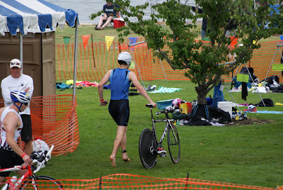 We left in time to make it into Lakeside Park, the race venue, about an hour before the transition zone would close for my race, 15min before the 7:30am race start. I raced here two years ago, and remembered that it would be a busy morning. I found my bike snuggled beneath the all-weather blanket that I'd left to protect it, and immediately set about setting up my transition zone.